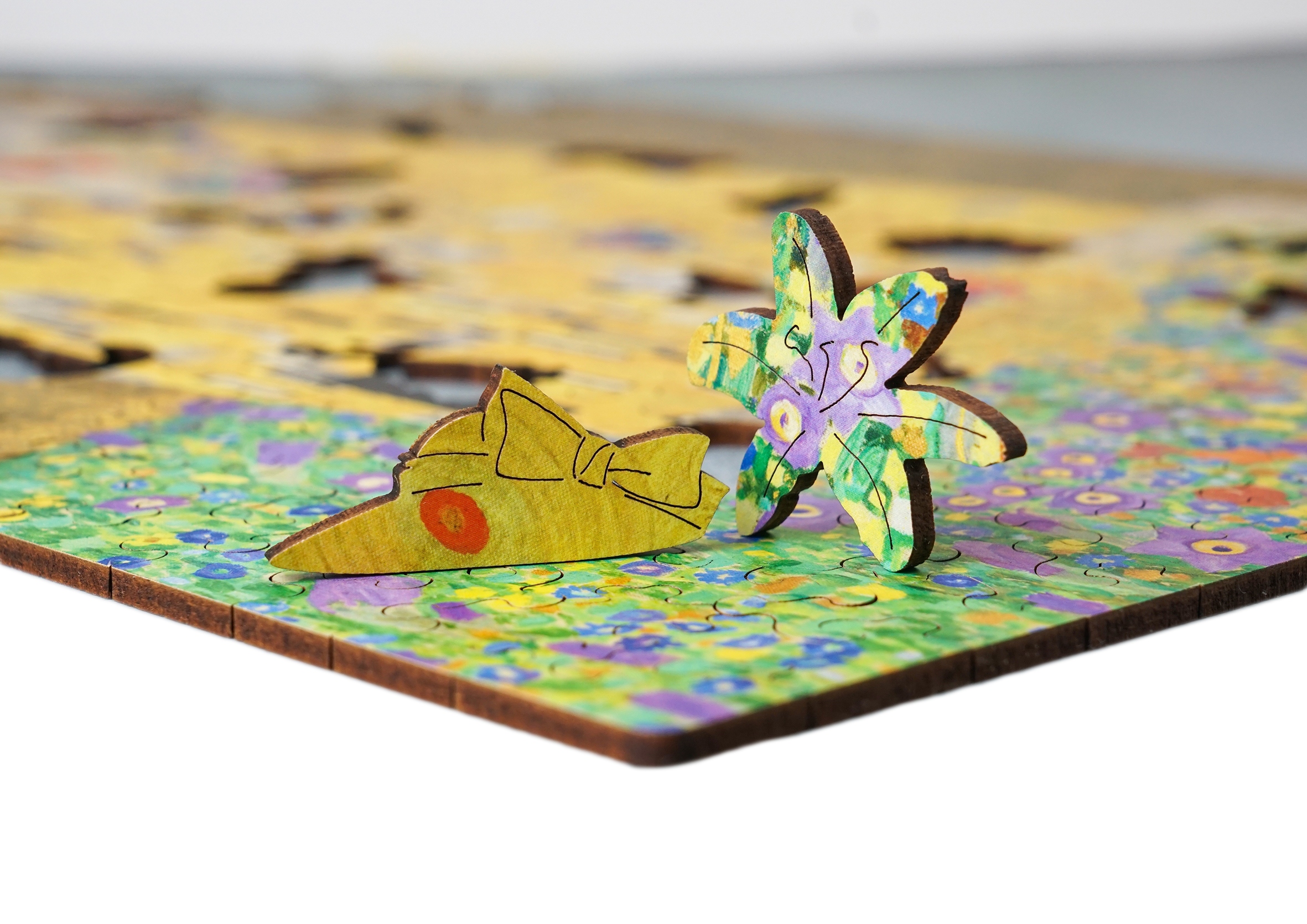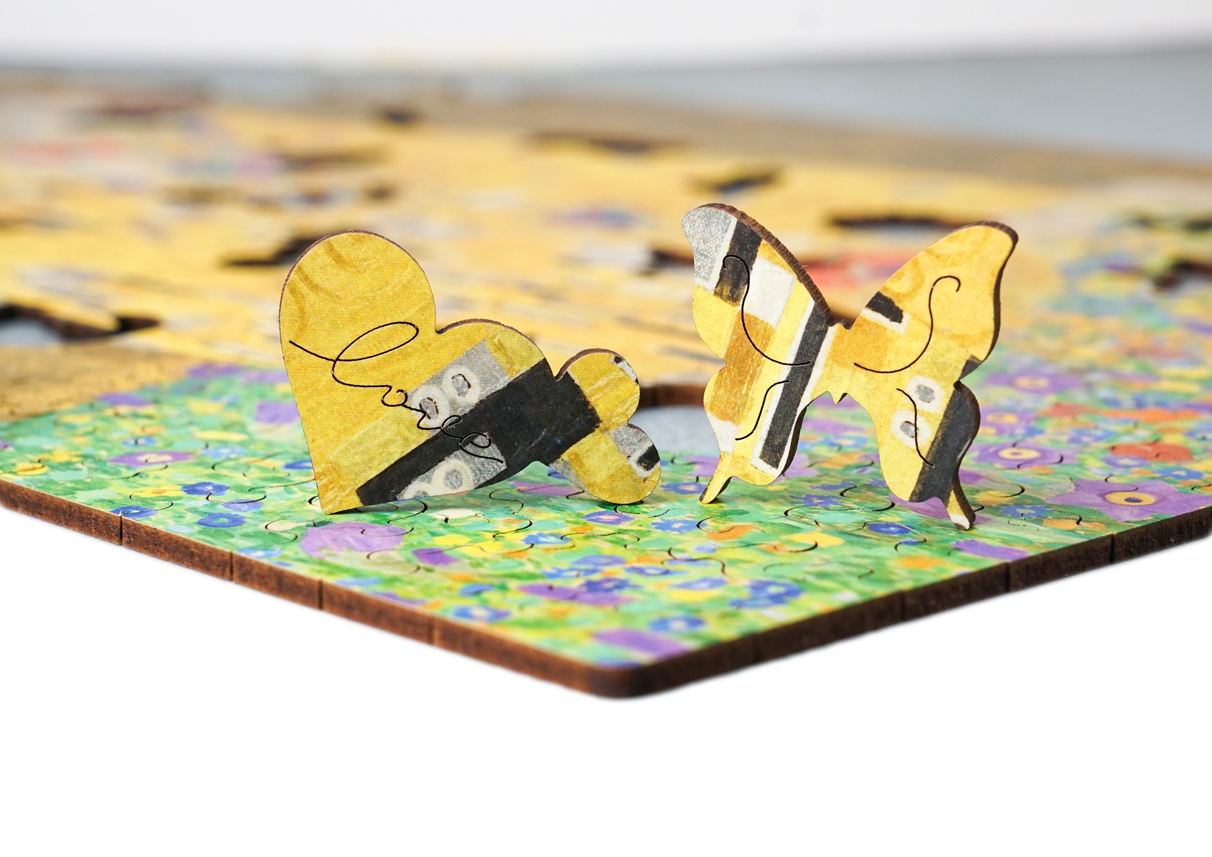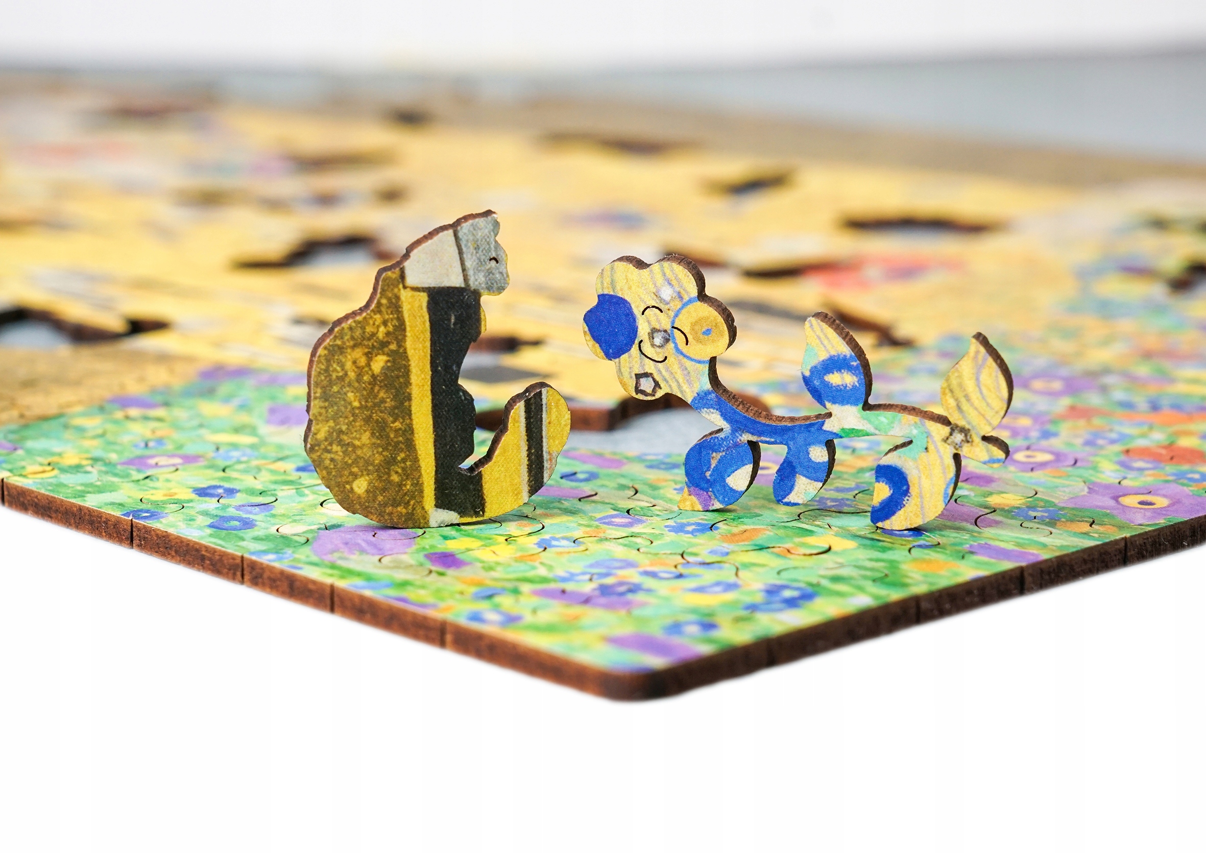 Przepiękne drewniane puzzle, przedstawiające obraz Gustava Klimt'a "Pocałunek".