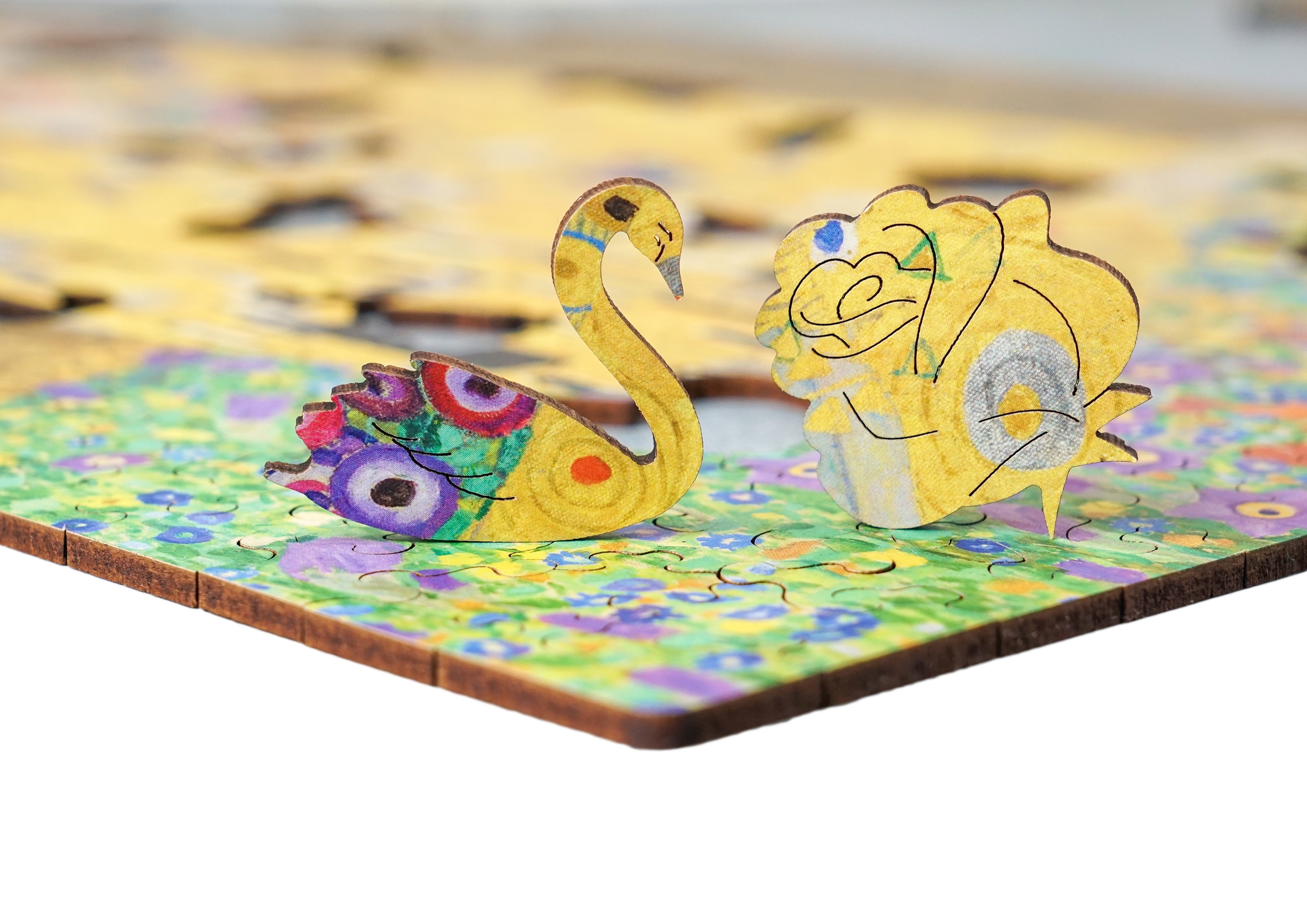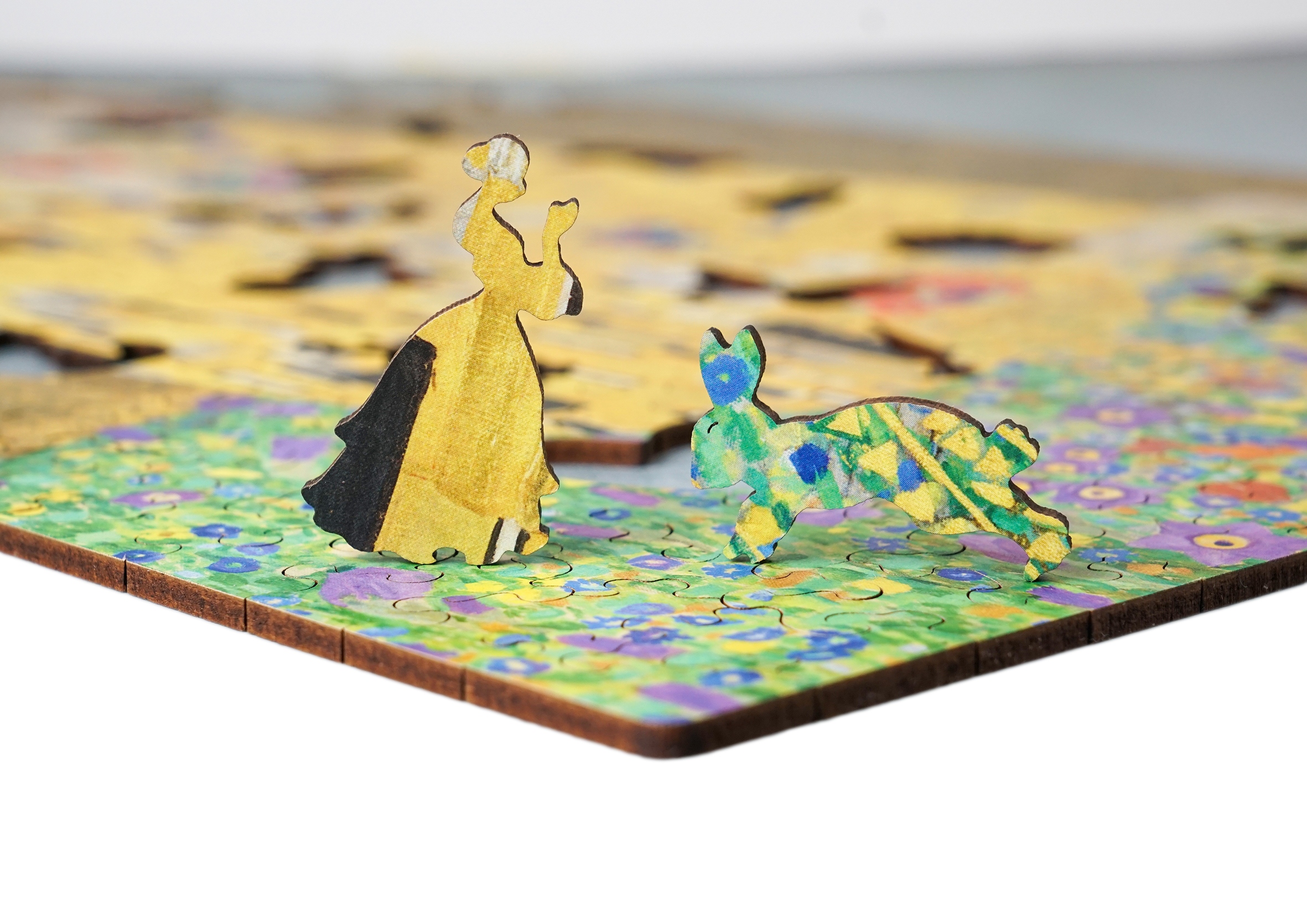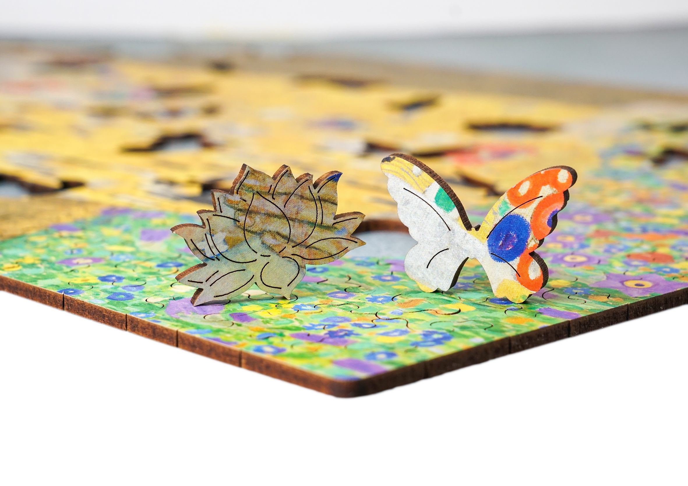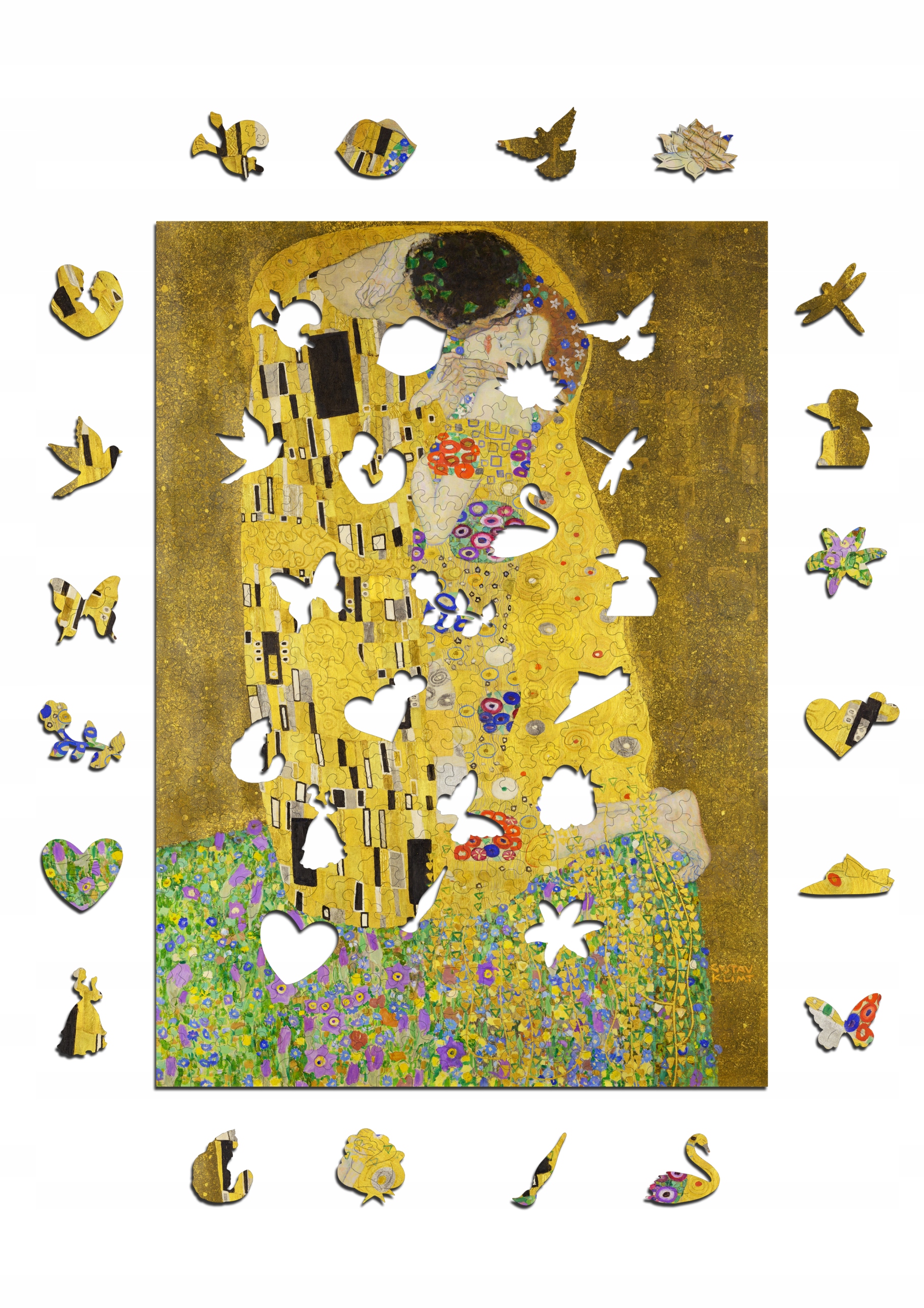 Przepiękne drewniane puzzle, przedstawiające obraz Gustava Klimt'a "Pocałunek".
